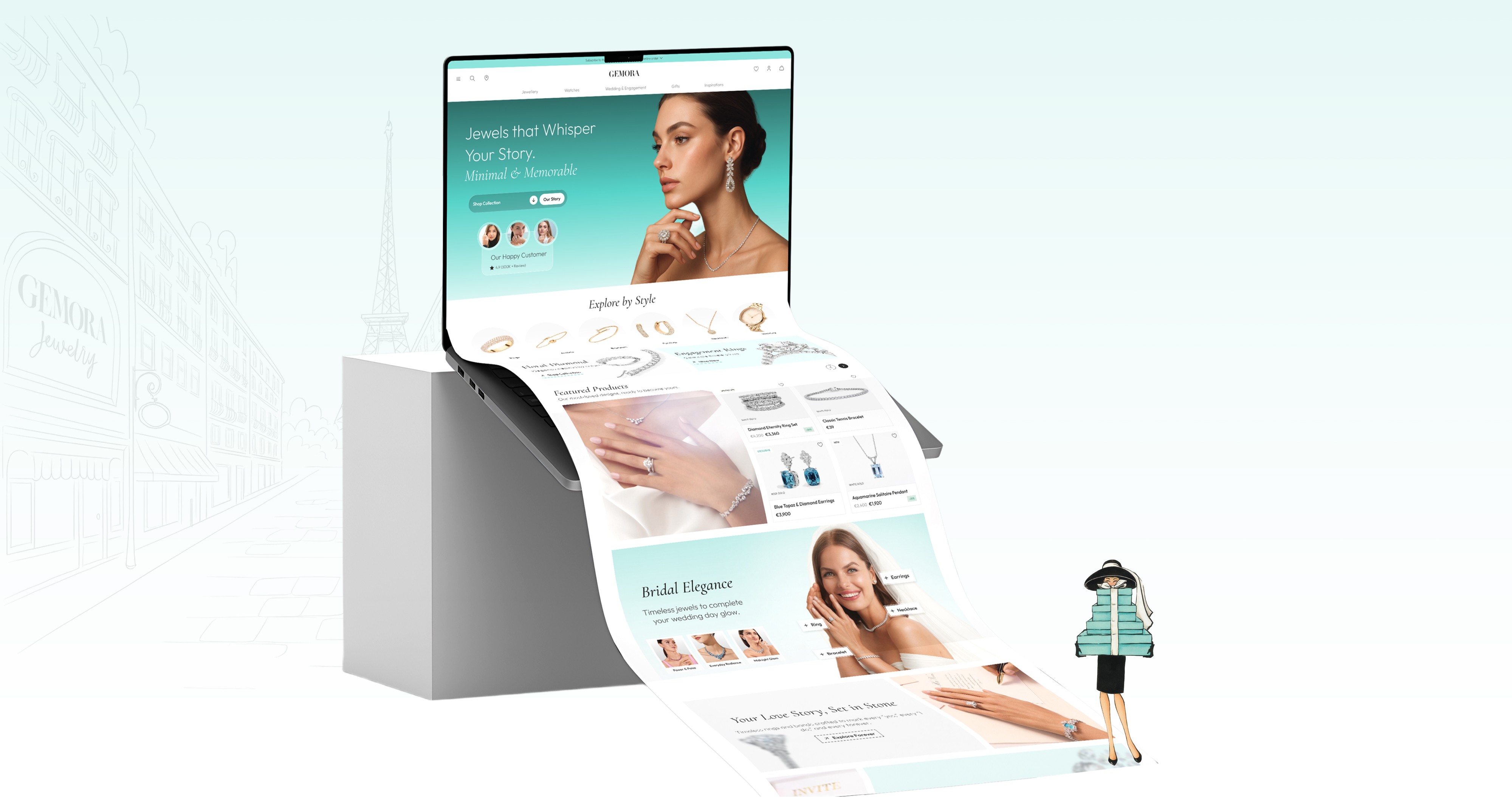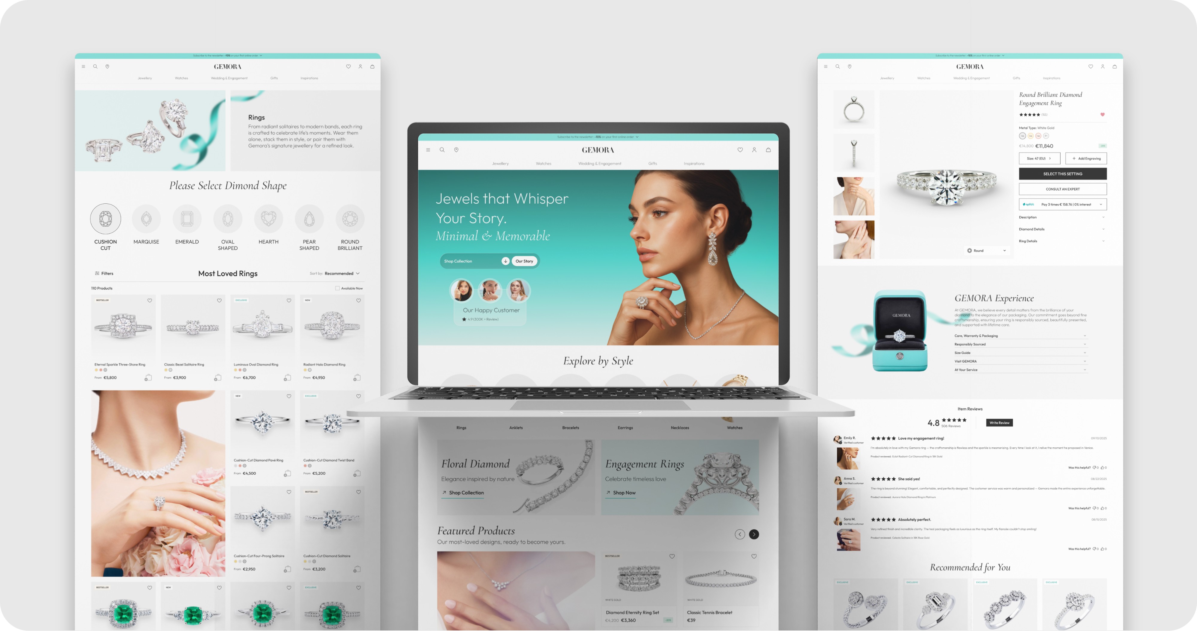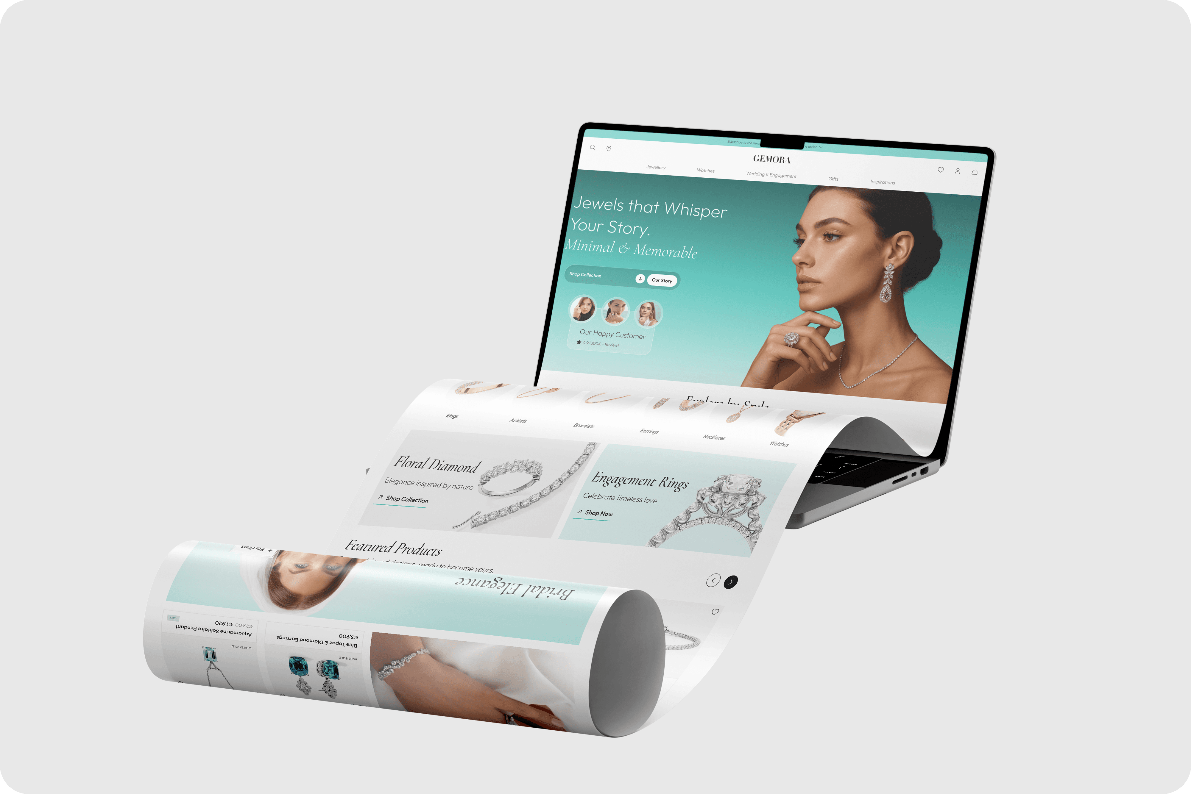 Gemora is a jewelry brand concept built around balance, emotion, and calm sophistication. Every element from product cards and collections to packaging and homepage flow reflects harmony between luxury and minimalism. The visuals follow a soft, editorial aesthetic inspired by watercolor textures, clean grids, and natural light.