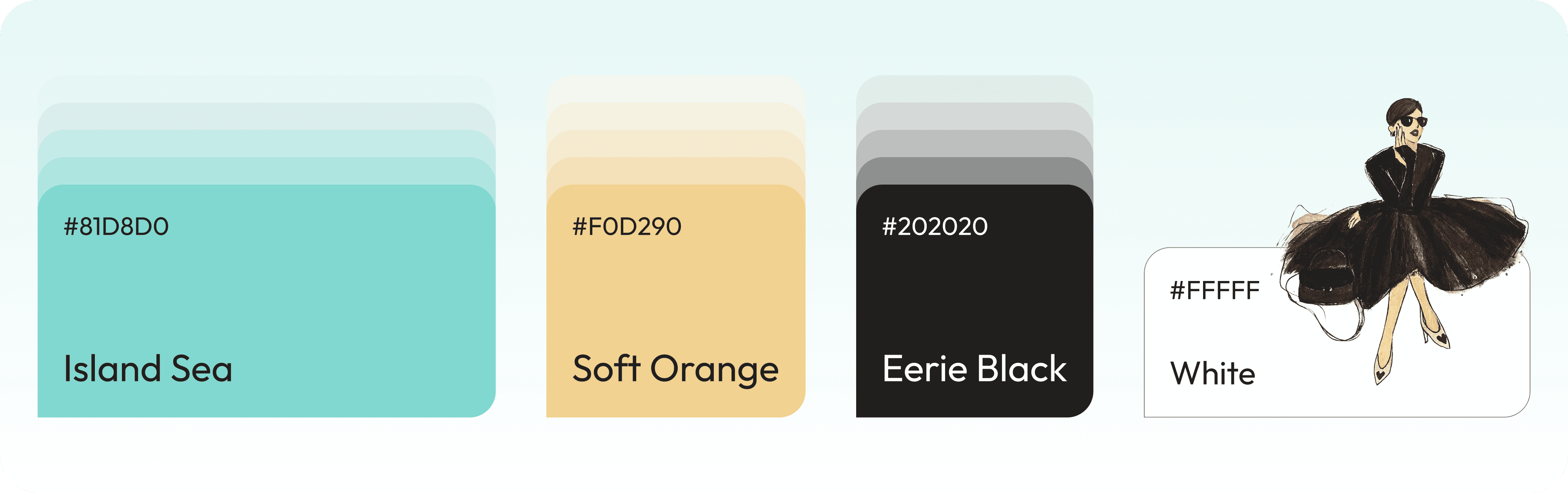 A balanced palette of White (clarity/minimalism) and Eerie Black (sophistication) is accented by Island Sea (calmness/trust) and Soft Orange (subtle richness/warmth).